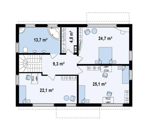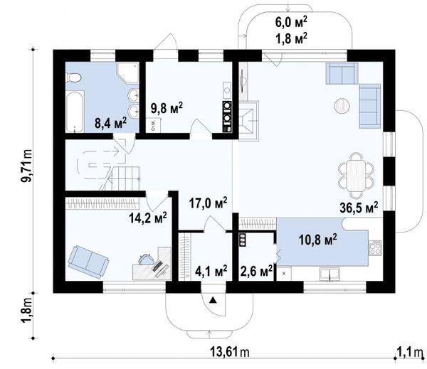 Проект позволяет построить прекрасно спланированный дом с удобным для жизни и экономичным с точки зрения эксплуатации пространством. В нём будет тепло зимой и прохладно летом.