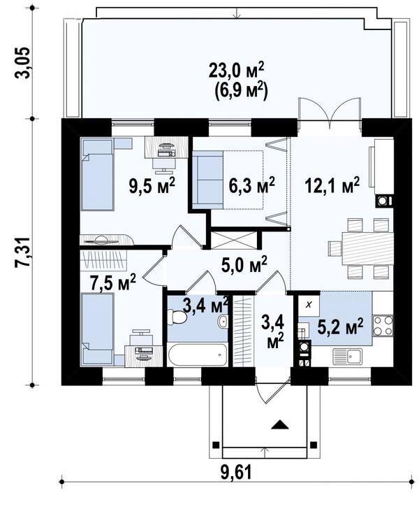 Площадь застройки: 70,25 m² (без учета террасы)
