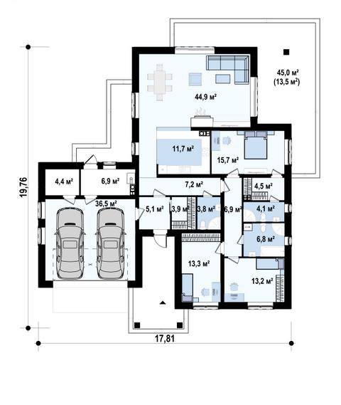 Проект представляет собой одноэтажный дом в скандинавском стиле с дополнительной фронтальной террасой и гаражом на две машины.