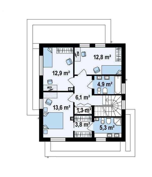 Проект – отличный вариант для тех, кто предпочитает двухэтажные планировки. Грамотно зонированный, функциональный интерьер удовлетворит потребности как молодого, так и старшего поколения